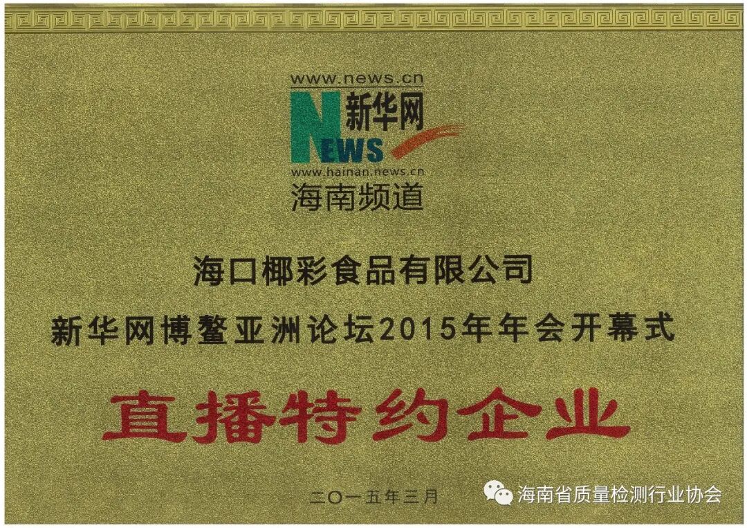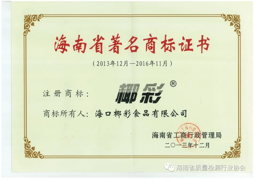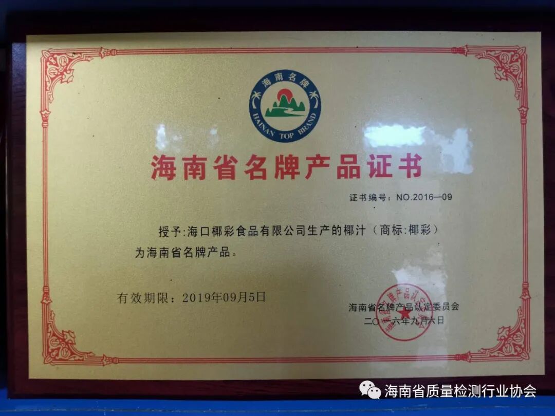 椰彩系列椰子汁饮料向来都是用品质和声誉来见证消费者的信赖的。2006年07月至2008年01月,海南省企业评价中心授予海口椰彩食品有限公司“海南省企业信用等级A﹢”;2007年09月,海南省质量协会授予海口椰彩食品有限公司“海南省质量协会饮用水行业自律委员会委员”;2011年07月,海南省标准化协会授予海口椰彩食品有限公司“海南省标准化协会副理事长单位”;2011年10月,第六届中国岭南美食文化节指定海口椰彩食品有限公司为唯一指定椰汁饮料赞助商;2011年11月,第十八届「美的杯」全球华人羽毛球锦标赛组委会审定批准,授予“海南海口椰彩食品有限公司——果肉椰子汁”为唯一指定椰汁饮料。